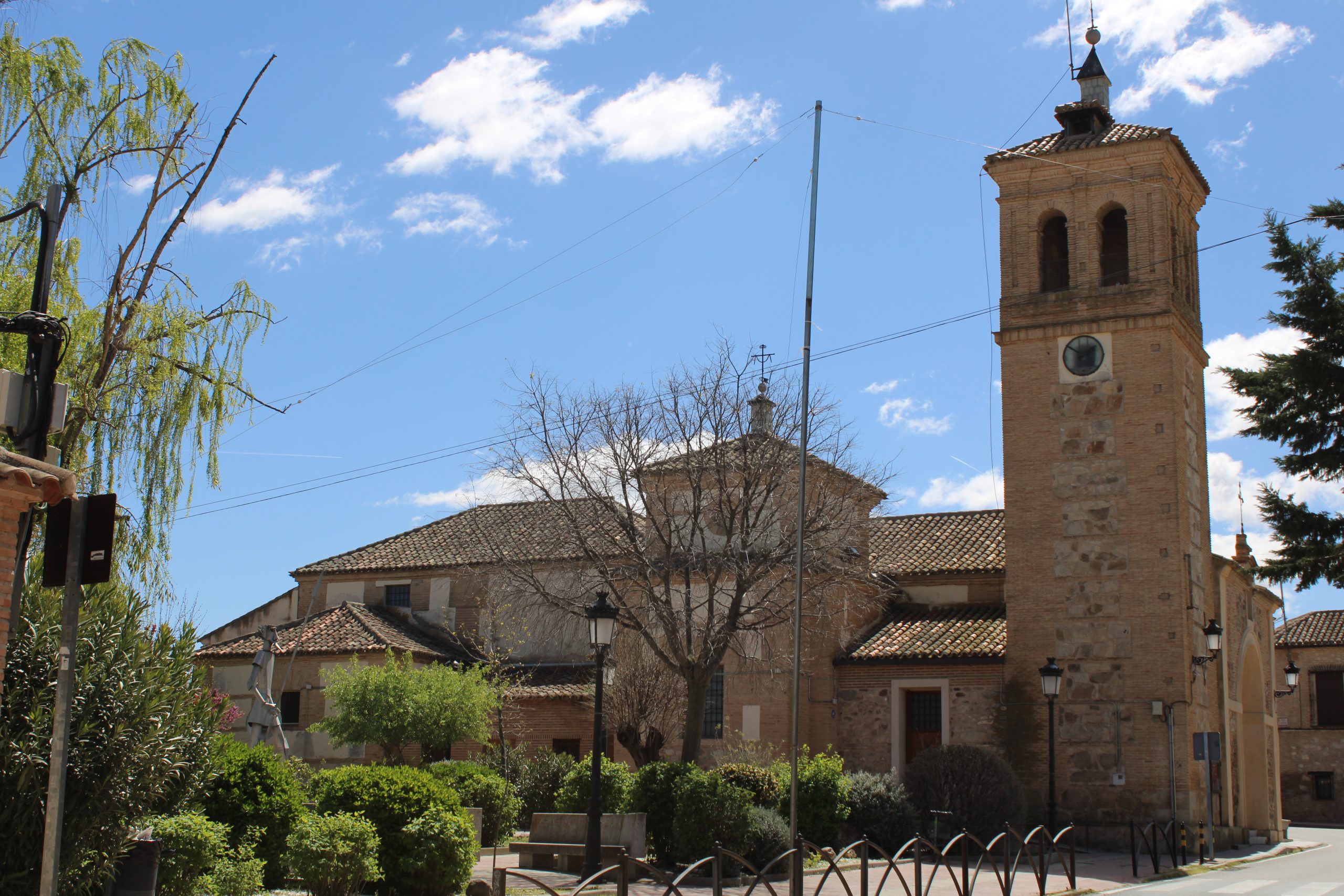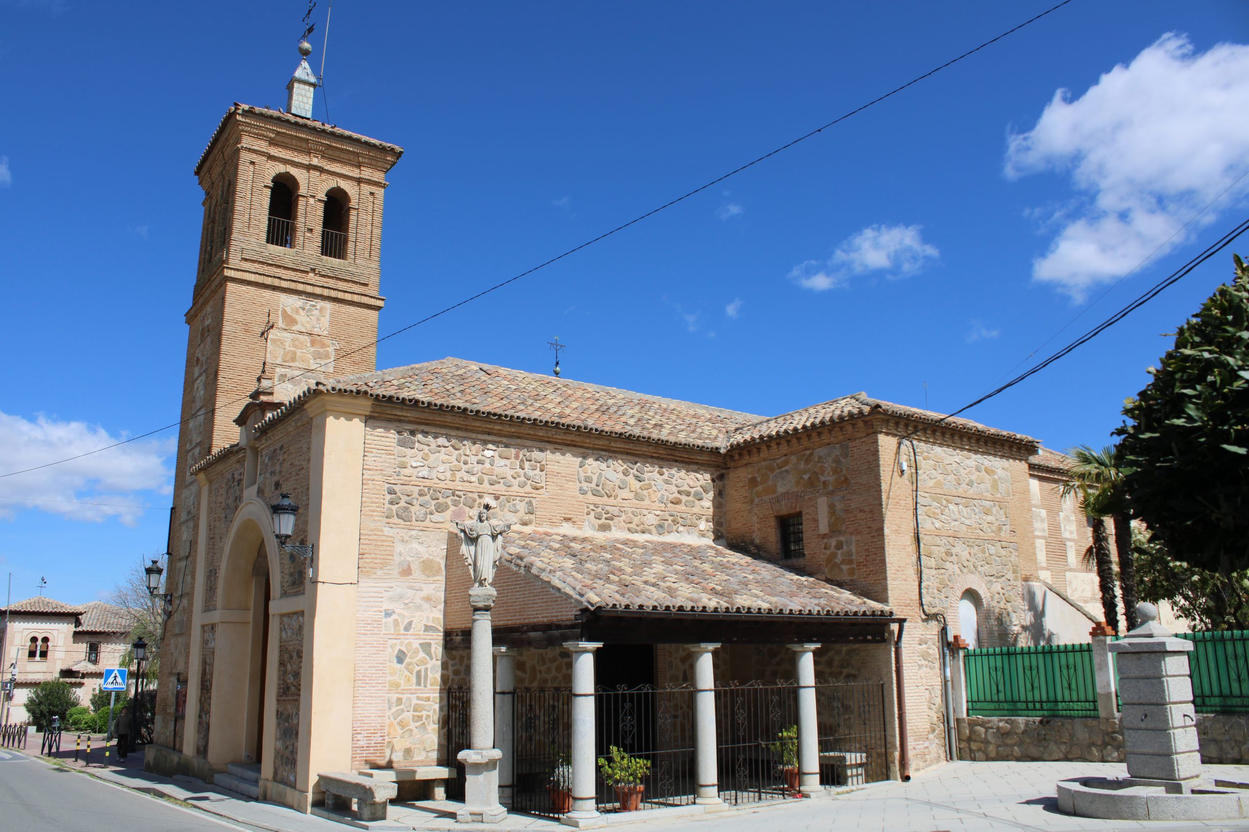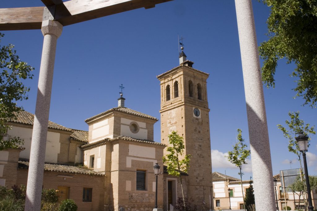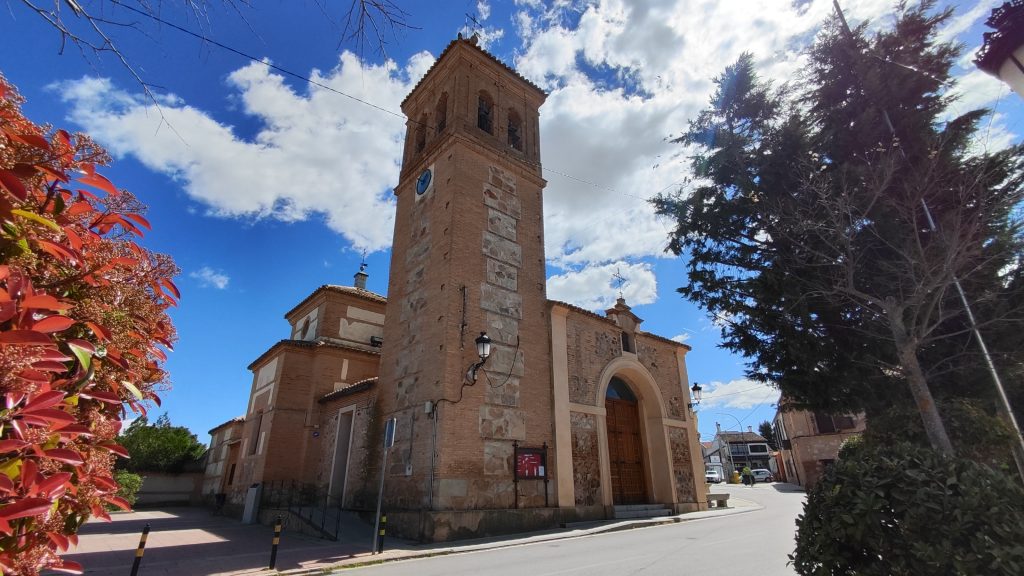 La iglesia presenta una planta de nave única, construida con el característico “aparejo toledano” que combina hileras de ladrillo con cajones de mampostería de piedra caliza y granito. Su torre campanario, de aspecto robusto y base cuadrada, es el elemento que define el perfil del casco antiguo y sirve de faro espiritual para los vecinos.